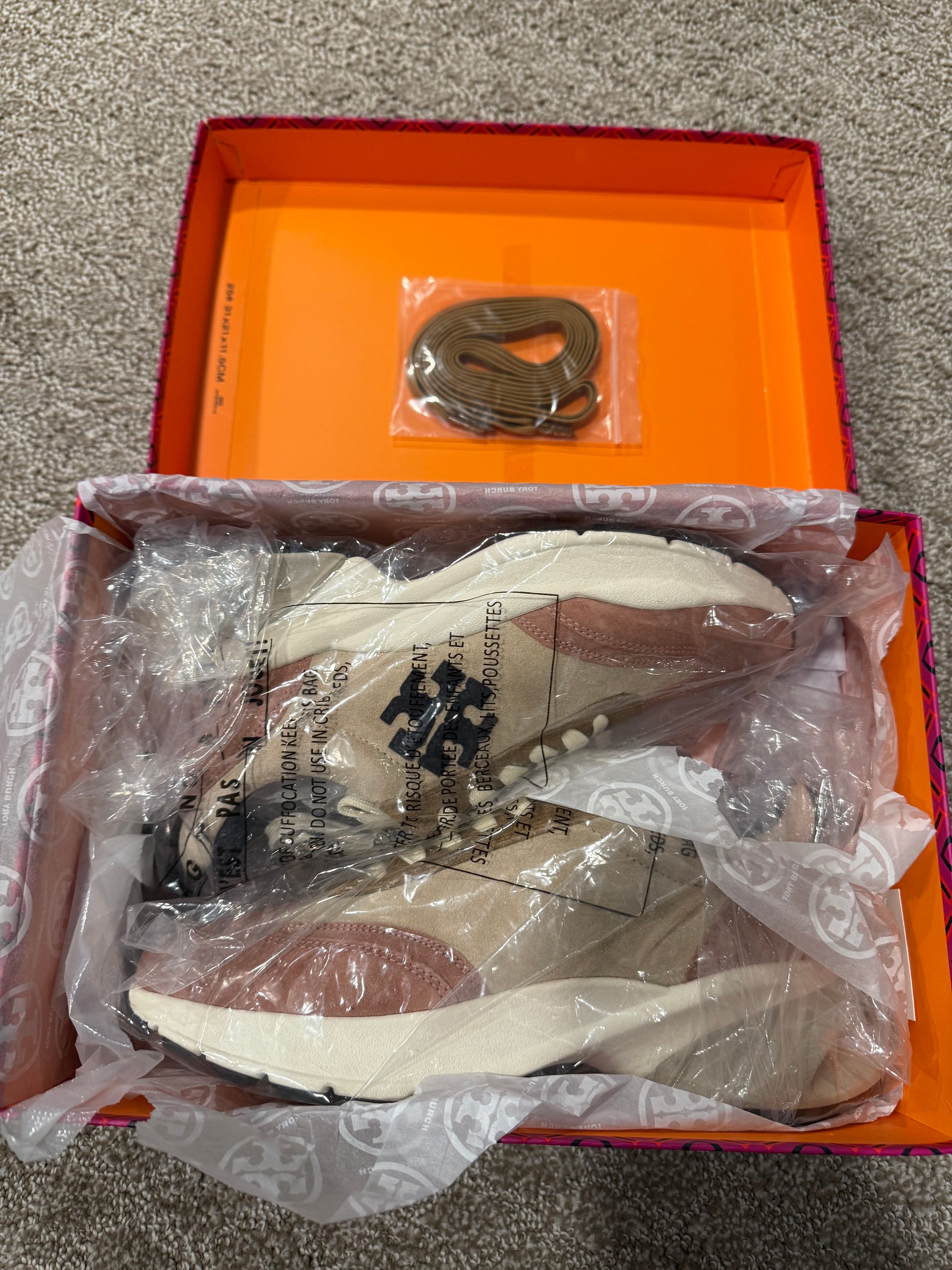 Stylish Tory Burch sneakers. Features pink and tan suede with cream laces. Comfortable and chic design.